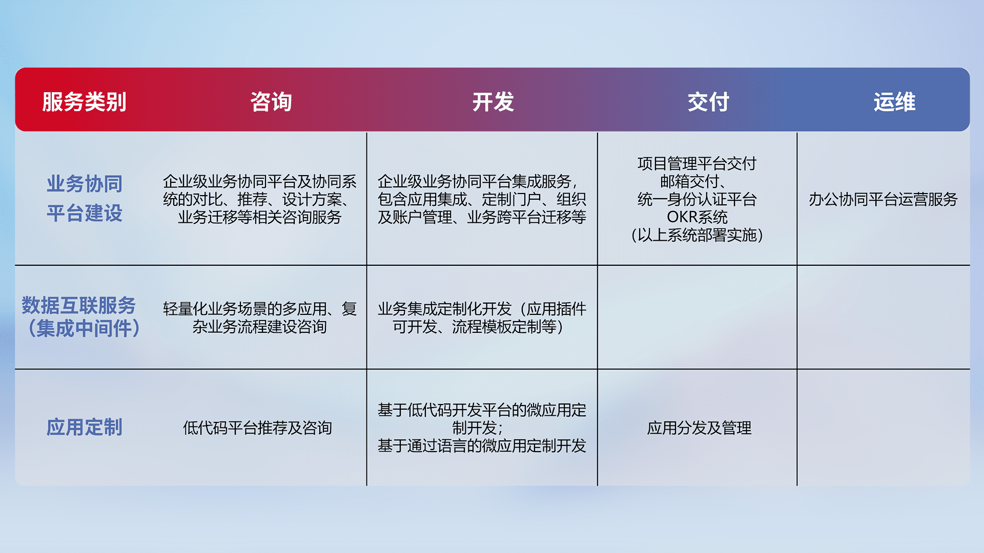 针对钉钉、、、、企微、、IDaas等平台级产品提供产品的规划、、方案、、交付、、定制化开发等服务,,实现如统一协同办公、、、、智能客户服务、、、、混合会议管理、、、、智能数据查询、、等业务场景,,,实现数字化转型。。。